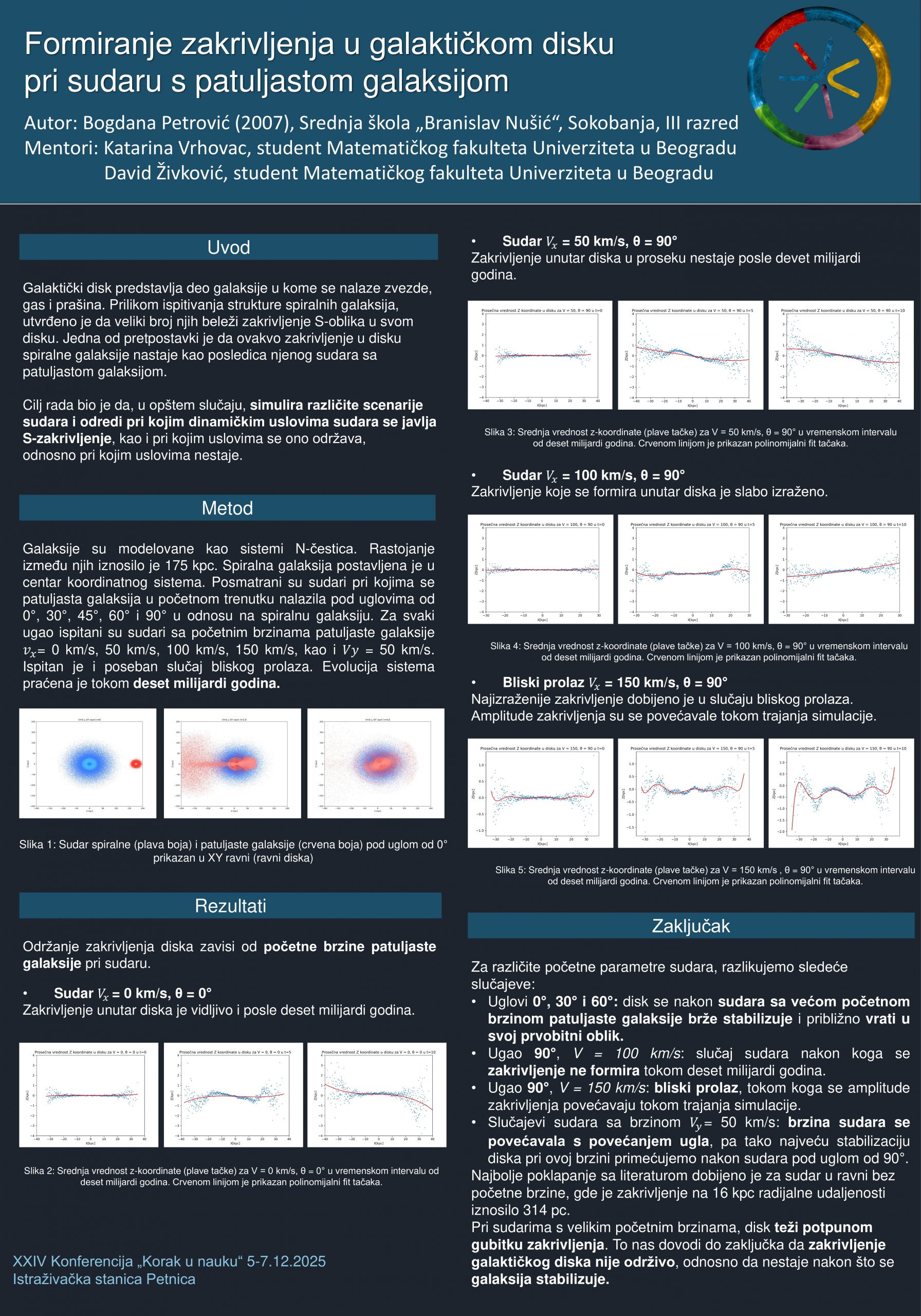 Kod dela spiralnih galaksija, primećeno je zakrivljenje galaktičkog diska na velikim radijalnim udaljenostima. Jedan od pretpostavljenih uzroka ovakve deformacije jeste preraspodela materije prilikom sudara s patuljastim galaksijama. Cilj ovog rada bio je da putem numeričkih simulacija ispita kako različiti početni uslovi sudara utiču na formiranje i održanje zakrivljenja diska. Analizirani su sudari pod uglovima od 0°, 30°, 60° i 90°, pri brzinama patuljaste galaksije Vx = 0, 50, 100, 150 km/s, i Vy = 50 km/s. Rezultati ukazuju na to da održanje zakrivljenja zavisi od brzine sudara. Pri uglovima od 0°, 30°, 60°, sporiji sudari dovode do zakrivljenja koje se održava do kraja simulacije, dok nakon bržih sudara, amplitude zakrivljenja opadaju posle devet milijardi godina. Pretpostavka je da zakrivljenje nestaje kada se galaksija stabilizuje. Kod sudara pod uglom od 90°, najslabije zakrivljenje formira se nakon sudara sa početnom brzinom Vx = 100 km/s. Pod istim uglom izdvojen je slučaj bliskog prolaza (Vx = 150 km/s), pri čemu se formira vizuelno najveće zakrivljenje. Amplitude zakrivljenja diska variraju sa početnim uslovima. Poređenjem sa rezultatima iz literature najbolje poklapanje dobijeno je u slučaju sudara u ravni bez početne brzine, gde je zakrivljenje na 16 kpc radijalne udaljenosti 314 pc, dok u literaturi iznosi 310 pc.