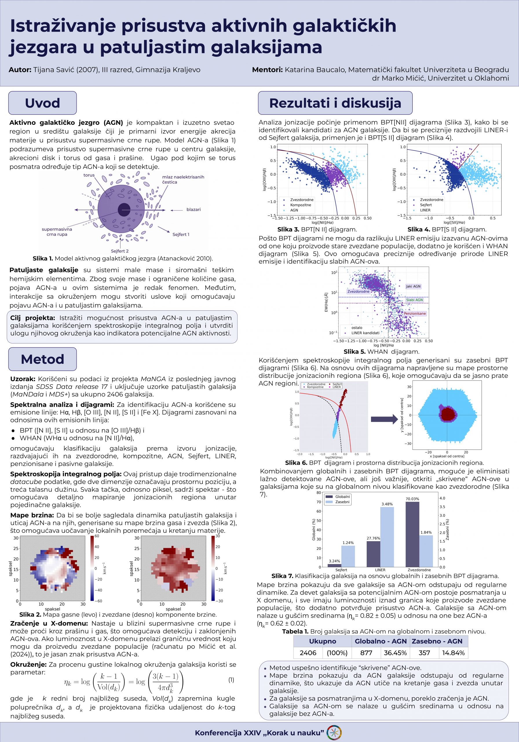 Aktivno galaktičko jezgro (AGN) je kompaktan i izuzetno svetao region u središtu galaksije čija energija potiče od akrecije materije u prisustvu supermasivne crne rupe. Iako je pojava AGN-a retka u patuljastim galaksijama zbog njihove male mase i ograničene količine gasa, cilj ovog projekta je bio da se istraži prisustvo AGN-a u 2406 patuljastih galaksija iz MaNGA projekta, uz pretpostavku da interakcije sa okruženjem mogu doprineti njihovoj pojavi. Za identifikaciju AGN-a korišćeni su BPT i WHAN dijagrami, pri čemu globalni BPT dijagrami prikazuju raspodelu galaksija prema odnosima emisionih linija, dok WHAN razdvaja prave AGN-ove od LINER emisije starih zvezda. Zasebni BPT dijagrami, generisani pomoću spektroskopije integralnog polja, omogućavaju otkrivanje „skrivenih“ AGN-ova. Identifikovano je 357 AGN galaksija (14.84%). Pouzdanost klasifikacije je potvrđena analizom mapa brzina gasne i zvezdane komponente, koje pokazuju da galaksije sa AGN-om odstupaju od regularne dinamike, kao i dostupnim posmatranjima u X-domenu za devet galaksija koja ukazuju da je izvor zračenja AGN, kako su izračunate luminoznosti iznad granica koje proizvode zvezdane populacije. Analiza okruženja pokazuje da se galaksije sa AGN-om nalaze u gušćim sredinama (ηk= 0.82 ± 0.05) u odnosu na galaksije bez AGN-a (ηk= 0.62 ± 0.02), što ukazuje na važnu ulogu okruženja.