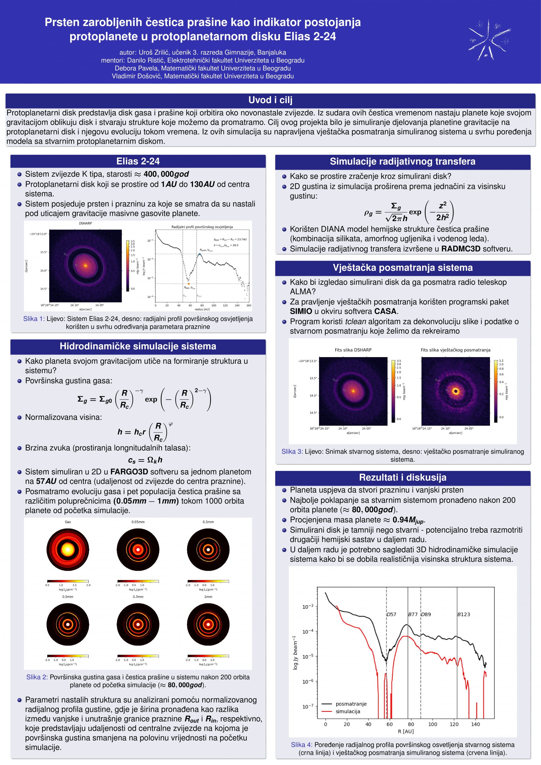 Protoplanetarni disk predstavlja disk gasa i prašine koji orbitira oko novonastale zvijezde i čijom evolucijom tokom vremena nastaju planete. Elias 2-24 je protoplanetarni disk koji se nalazi oko mlade zvijezde K tipa starosti ≈ 400,000 godina. Disk ovog sistema se prostire do 140 AU od centra i posjeduje široku prazninu na 57 AU od centra, kao i tanak prsten na 77 AU od centra. Obradom slika posmatranja ALMA opservatorije pronađena je vrijednost za širinu praznine. Cilj ovog projekta je simuliranje formiranja struktura u ovom sistemu kao rezultat interakcije mlade protoplanete i protoplanetarnog diska i poređenje ovih simulacija sa stvarnim sistemom. Za simuliranje evolucije gasa i prašine u ovom sistemu kao rezultat interakcije planeta-disk korišten je softver za hidrodinamičke simulacije FARGO3D. U svrhu poređenja stvarnog sistema i modela, izvršene su simulacije radijativnog transfera pomoću softvera RADMC3D, a kasnije i simulacije vještačkog posmatranja u svrhu poređenja modela i stvarnog sistema pomoću softvera CASA i programskog paketa SIMIO. Model je uspio da formira prazninu i vanjski prsten koji se po svojim parametrima za širinu i radijalnu udaljenost od centra poklapaju sa stvarnim protoplanetarnim diskom nakon 80,000 godina od početka simulacije.