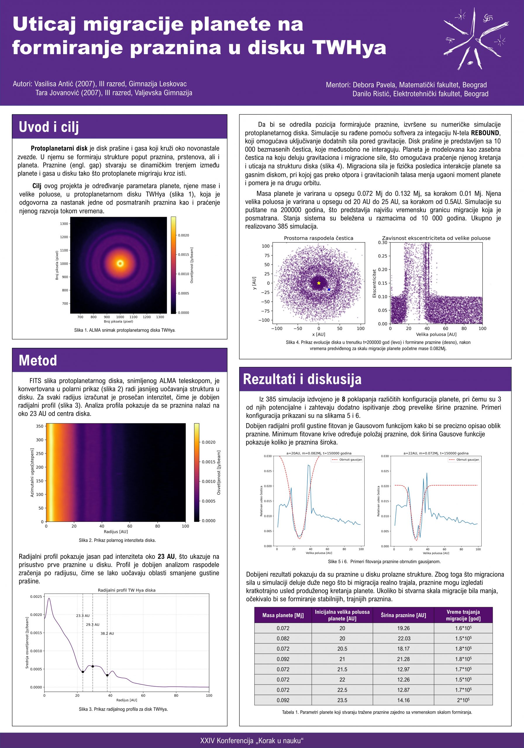 Protoplanetarni disk TWHya formiran je oko mlade T-Tauri zvezde, koji se prostire do oko 100 AU. Na slici diska snimljenog ALMA teleskopom jasno se vide praznine od kojih je jedna proučavana u ovom radu. Slika diska konvertovana je u polarni prikaz kako bi se izdvojio radijalni profil osvetljenja. U profilu jasno se uočava pad intenziteta na oko 23 AU, što odgovara posmatranoj praznini. Cilj ovog projekta je određivanje odgovarajuće vrednosti za dva parametra planete koja su varirana – masa i velika poluosa. Ovi parametri su odgovorni za formiranje željene praznine u disku. Za simulacije korišćen je softver za integraciju N-tela REBOUND, pri čemu je prašina predstavljena sa 10 000 bezmasenih čestica. Planeta je modelovana kao zasebna čestica na koju deluju migracione sile. Efekat migracije predstavljen je preko interakcije planete sa gasom u disku. Ovakav pristup omogućava praćenje preraspodele materijala i evolucije struktura u disku tokom određenog vremena. Fitovanjem profila obrnutom Gausovom funkcijom određena je precizna lokacija i širina posmatrane praznine. Ukupno je realizovano 385 numeričkih simulacija sistema sa različitim konfiguracijama planete. Identifikovano je ukupno 8 konfiguracija zaduženih za formiranje posmatrane praznine. Tri od njih se izdvajaju kao potencijalne i zahtevaju dodatno ispitivanje.
