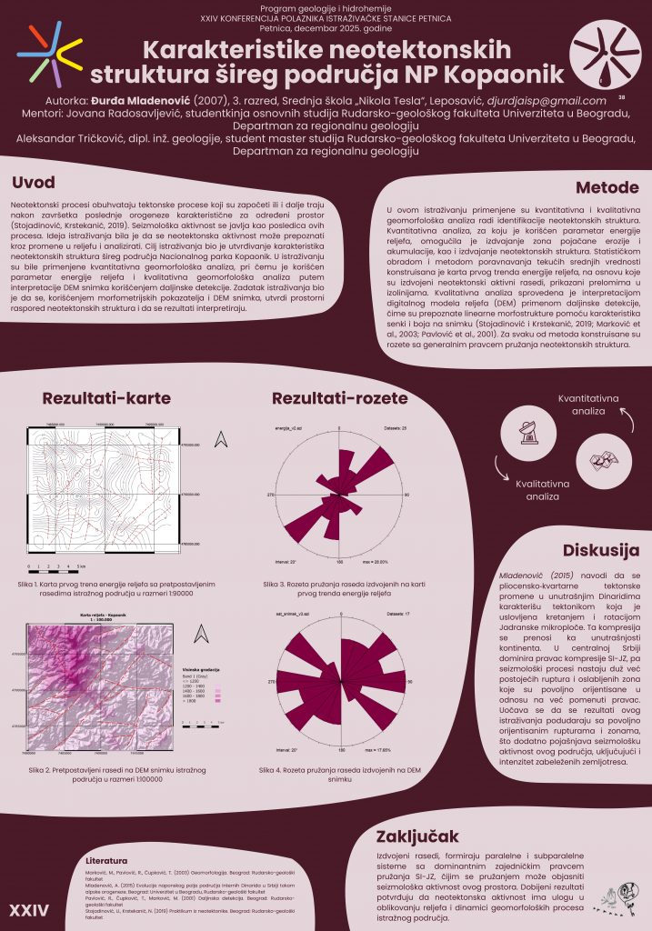 Istraživanje je imalo za cilj utvrđivanje karakteristika neotektonskih struktura šireg područja Nacionalnog parka Kopaonik primenom kvantitativne i kvalitativne geomorfološke analize. Kvantitativna analiza podrazumevala je računanje energije reljefa, dok je interpretacija digitalnog modela reljefa (DEM) primenom metoda daljinske detekcije bila deo kvalitativne geomorfološke analize. Na osnovu dobijenih podataka izrađene su karta energije reljefa i karta prvog trenda energije reljefa. Na karti energije reljefa izdvojene su zone pojačane erozije i akumulacije, a analizom prvog trenda energije reljefa i analizom DEM snimka pretpostavljeni su rasedi, čiji su pravci pružanja prikazani rozetama. Sa rozeta se uočava da je dominantni pravac pružanja pretpostavljenih raseda SI-JZ. Analizirajući geološku kartu uočava se da se pojedini pravci pružanja pretpostavljenih raseda poklapaju sa granicama litoloških jedinica.