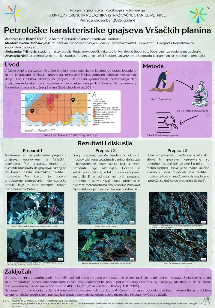Uzorkovane su stene za petrografsku analizu na južnim padinama Vršačkih planina. Terenskim metodama opservirane su regionalno metamorfne stene Srpsko- makedonske mase (albitski sitnozrni i okcasti muskovitski gnajsevi) čiji su uzorci potom pripremljeni za analizu pod polarizacionim mikroskopom. Petrografska analiza obuhvatala je opisivanje svakog preparata na osnovu mineralnog sastava i strukturno-tekstrunih karakteristika koji se uočavaju u steni. Uočeni su različiti pravci orijentacije liski muskovita, undulatorno pomračenje kvarca i nabori koji ukazuju na srednji stepen metamorfizma koji se odvijao u dve faze.