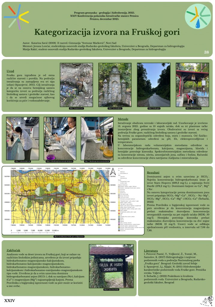 Geološka građa Fruške gore predstavljena je stenama različite starosti i porekla. Na području istraživanja zastupljeni su pukotinski, intergranularni i karstni tip izdani. Takođe su zastupljeni uslovno-bezvodni tereni. Cilj istraživanja bio je da se na osnovu hemijskog sastava kategorišu izvori sa područja različitog litološkog sastava i geološke starosti, kao i da se utvrdi mogućnost njihovog korišćenja za piće i vodosnabdevanje. Uzorkovanje vode je izvršeno 13. avgusta 2025. godine sa 10 stajnih tačaka sa većeg područja planine. Na osnovu koncentracija makrokomponenti, izvori su kategorisani prema dominantnim jonima. Rezultati istraživanja su pokazali da je dominantan anjon u svim uzorcima HCO3– , dok su dominantni katjoni Ca2+ , Mg2+ i Na+ + K+ . Na osnovu Pravilnika o higijenskoj ispravnosti vode za piće, voda se može koristiti u iste svrhe, osim izvora koji su imali povišenu koncentraciju hemijske potrošnje kiseonika (HPK) i Mg2+ . Koncentracije ostalih jona ne prelaze maksimalnu dozvoljenu koncentraciju. Hemijski sastav ovih izvora može se povezati sa geološkom građom terena.