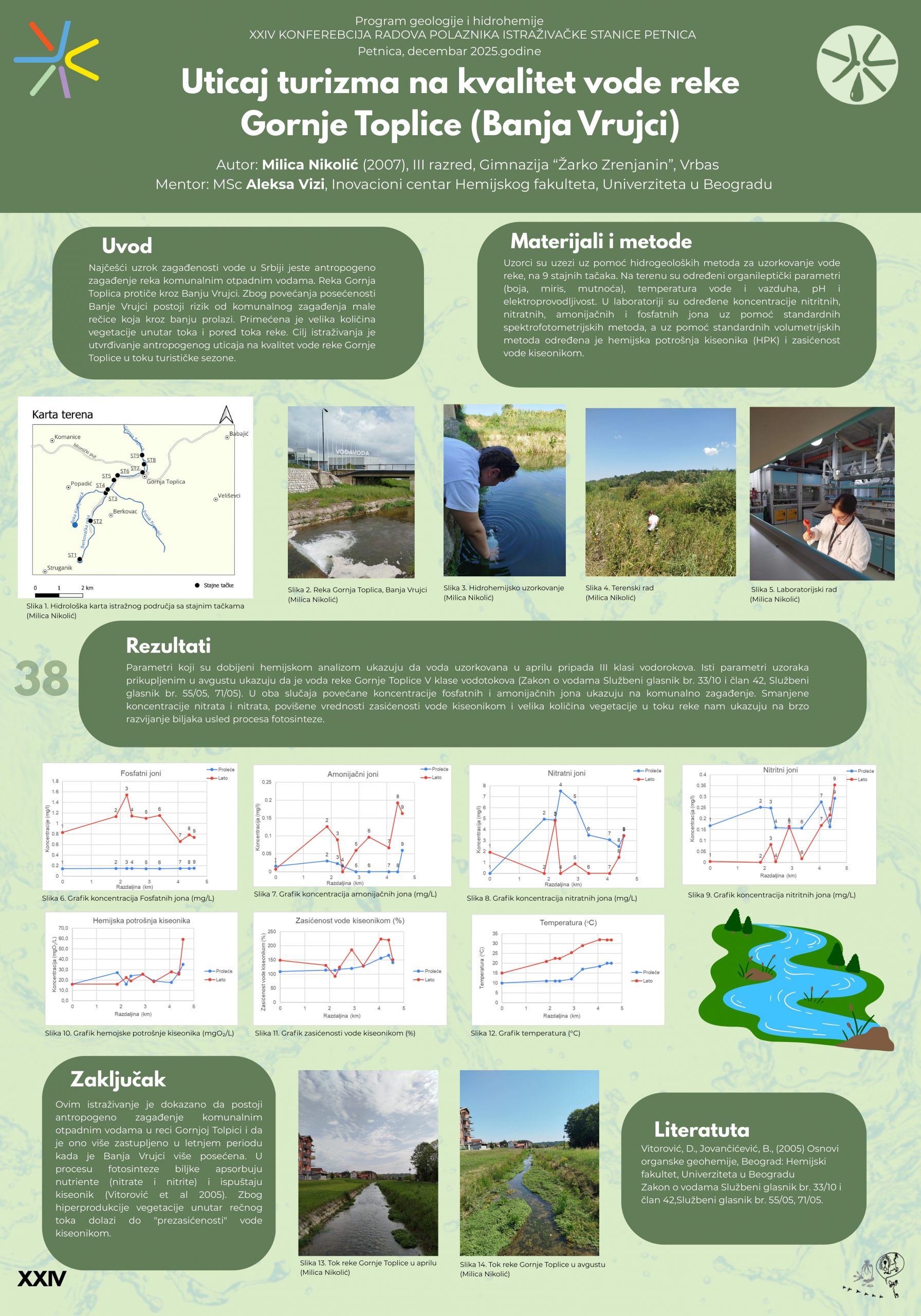 Cilj istraživanja je upoređivanje antropogenog zagađenja komunalnim otpadnim vodama u vodi reke Gornje Toplice pre početka i u toku turističke sezone. Istraživanje je izvršeno u aprilu i avgustu 2025. godine. Koncentracije nitritnih, nitratnih, amonijačnih i fosfatnih jona su određene pomoću spektrofotometrijske metode, a hemijska potrošnja kiseonika (HPK) i koncentracija kiseonika su određene volumetrijskom metodom. Zasićenost vode kiseonikom je određena računski koristeći rezultate koncentracija kiseonika. Rezultati hemijskih analiza pokazali su da su koncentracije nitritnih i nitratnih jona niže u avgustu za razliku od aprila. Nasuprot tome koncentracije amonijačnih i fosfatnih jona su niže u aprilu u poređenju sa avgustom. Hemijska potrošnja kiseonika je pri oba uzorkovanja približnih vrednosti, dok zasićenost vode kiseonikom ima duplo veće vrednosti u avgustu. Jedno od mogućih uzroka smanjenih vrednosti koncentracija nitratnih i nitritnih jona i povećanih vrednosti zasićenosti vode kiseonikom u avgustu jeste velika količina vegetacije u profilu rečnog toka koja apsorbuje nutriente (nitriti i nitrati) i ispušta kiseonik u procesu fotosinteze. Povećane koncentracije amonijačnih i fosfatnih jona mogu se objasniti svežim zagađenjem komunalnim otpadnim vodama.