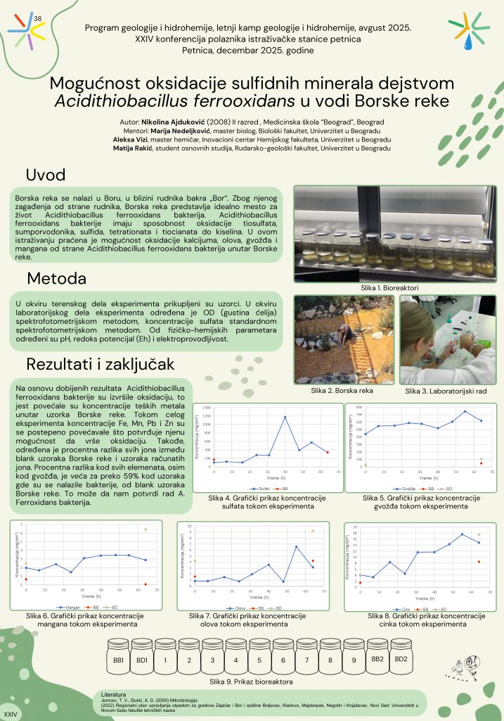 Uzeto je 12 litara vode iz Borske reke koja je Uzorkovana je voda iz Borske reke koja je kontaminirana od strane rudnika bakra Bor. Unutar navedene reke nalaze se Acidithiobacillus ferrooxidans bakterije. Ova aerobna bakterija, izolovana iz Borskog rudnika, sposobna je da oksiduje gvožđe(II) i jedinjenja sumpora do kiselina, što predstavlja ozbiljan ekološki problem usled zagađenja Borske reke. Uzorkovana voda je spojena u kompozitni uzorak i raspoređena u 13 bioreaktora sa dodatkom rude cinka i olova, uz kontrolne grupe. Dodavanjem azotne kiseline, pH je podešen na oko 2, a u bioreaktore je dodat čist soj Acidithiobacillus ferrooxidans bakterija. Proces je praćen uzorkovanjem tri puta na dan. Gustina ćelija (OD) je merena spektrofotometrijski, dok su koncentracije gvožđa, olova, mangana, cinka, sulfata, kao i pH, Eh određivani standardnim metodama radi procene napretka biooksidacije. Istraživanje je imalo za cilj da pokaže mogućnost oksidacije sulfidnih minerala dejstvom Acidithiobacillus ferrooxidans bakterija i brzinu te oksidacije u uslovima rudničke vode. Ustanovljeno je slabije, ali postojano vršenje oksidacije od strane Acidithiobacillus ferrooxidans bakterija.
