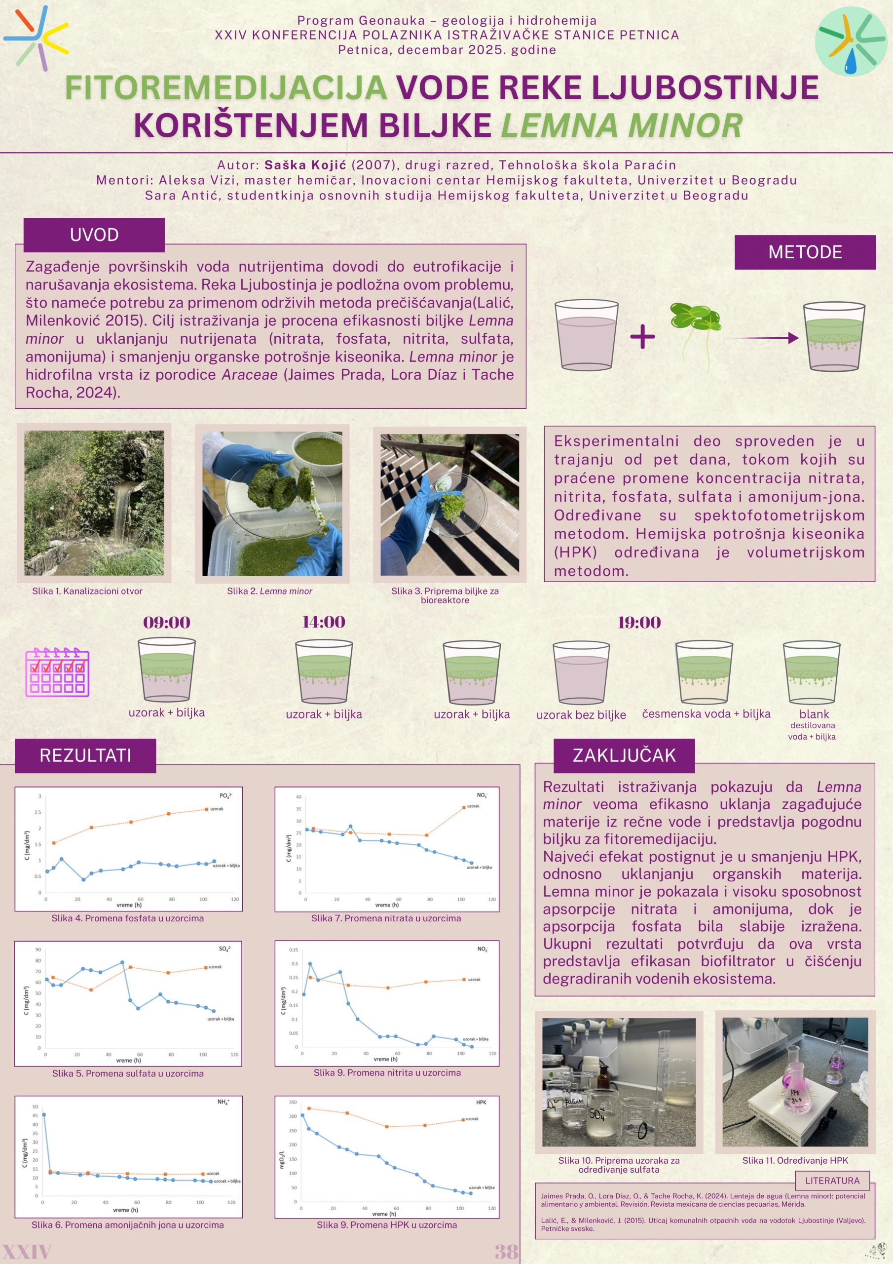 Antropogeno zagađenje reka predstavlja jedan od najvećih ekoloških problema savremenog doba. U ovom istraživanju, sprovedenom tokom pet dana, ispitivana je sposobnost biljke Lemna minor da uklanja nutrijente iz vode reke Ljubostinje. Dobijeni rezultati pokazali su da biljka uspešno apsorbuje jone amonijaka, sulfata, nitrata i nitrita, kao i da značajno smanjuje vrednost hemijske potrošnje kiseonika (HPK). Na osnovu toga može se zaključiti da Lemna minor ima visok potencijal za primenu u procesima prečišćavanja voda zagađenih ovim nutrijentima, odnosno u fitoremedijaciji.