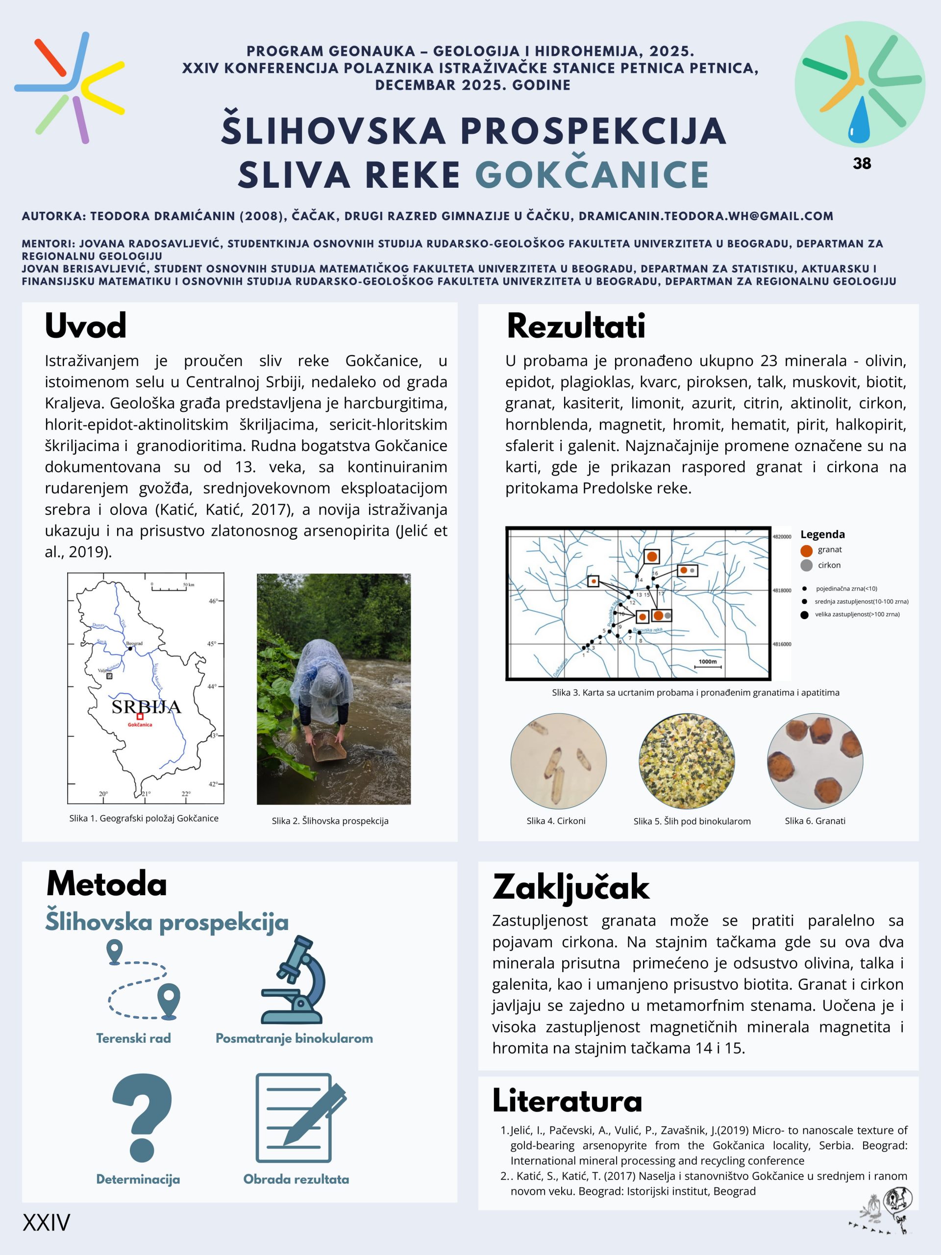 Predmet istraživanja bila je zastupljenost minerala u slivu reke Gokčanice. Istraživanje je sprovedeno metodom šlihovske prospekcije, koja obuhvata odlazak na teren i prikupljanje uzoraka šliha, najsitnijeg koncentrata minerala rečnog korita, i laboratorijsku analizu proba pod binokularom. Utvrđeno je postojanje 23 minerala, od kojih su 7 rudni. Primećena je učestala pojava granata i cirkona, kao i 13 minerala gvožđa. Rezultati istraživanja sistematizovani su u tabeli koja prikazuje zastupljenost pojedinačnih minerala.