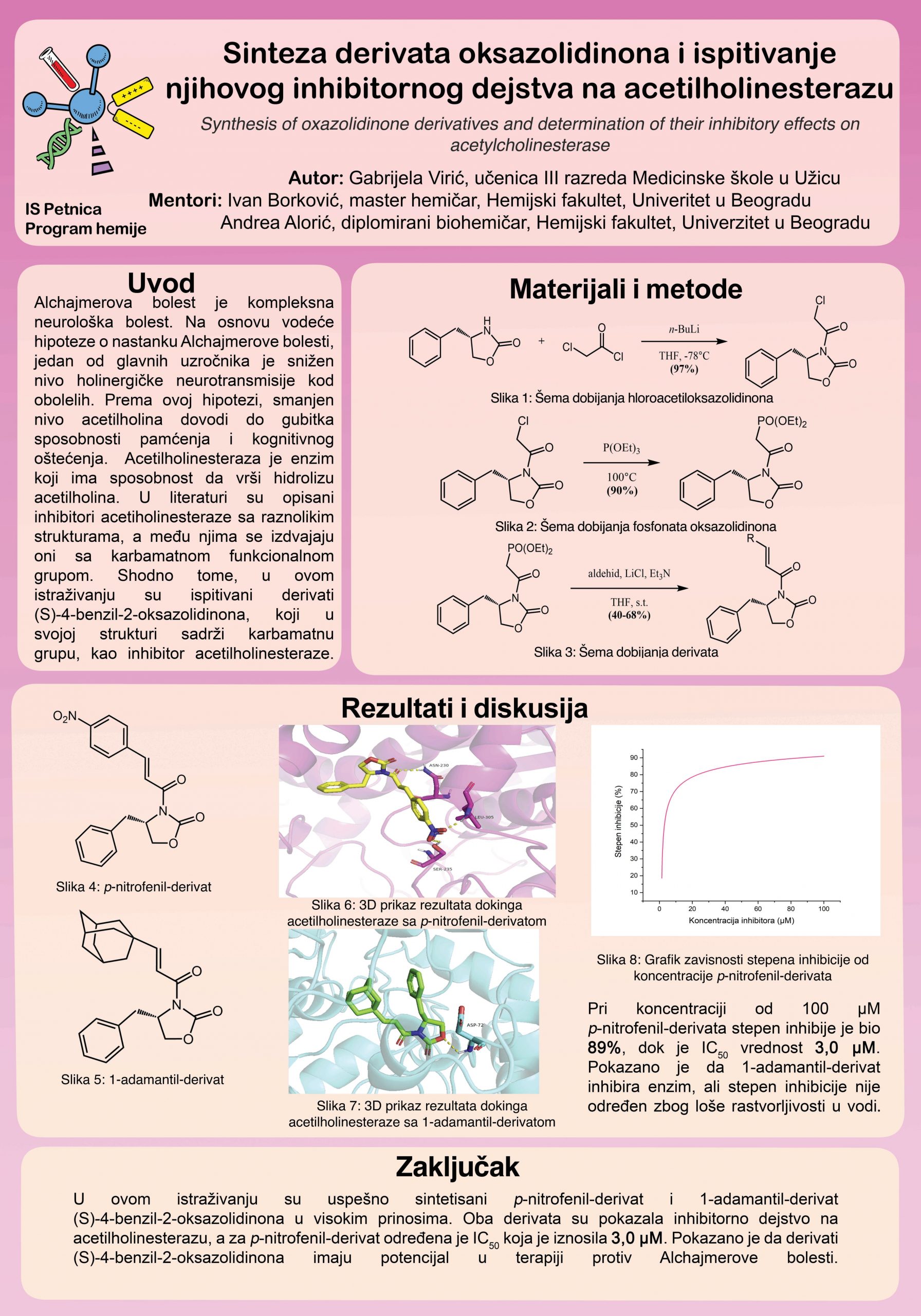Terapijski pristup za poboljšanje kognitivnih funkcija kod pacijenata sa Alchajmerovom bolešću najčešće se zasniva na pojačavanju centralne holinergičke aktivnosti, što se postiže primenom inhibitora acetilholinesteraze. Dosadašnja istraživanja pokazala su da se jedinjenja koja sadrže karbamatnu grupu ponašaju kao veoma efikasni inhibitori ovog enzima. Rezultati molekulskog dokovanja pokazali su da derivati (S)-4-benzil-2-oksazolidinona ostvaruju visoke energije vezivanja sa enzimom. Shodno tome, sintetisani su p-nitrofenil i 1-adamantil derivati (S)-4-benzil-2-oksazolidinona i ispitano je njihovo inhibitorno dejstvo. Obe ispitivane strukture pokazale su aktivnost, pri čemu je IC₅₀ vrednost za p-nitrofenil-derivat iznosila 3,0 μM, dok za 1-adamantil-derivat nije određena zbog loše rastvorljivosti u vodi. Dobijeni rezultati ukazuju na to da derivati (S)-4-benzil-2-oksazolidinona poseduju potencijal u terapijskom pristupu lečenju Alchajmerove bolesti.