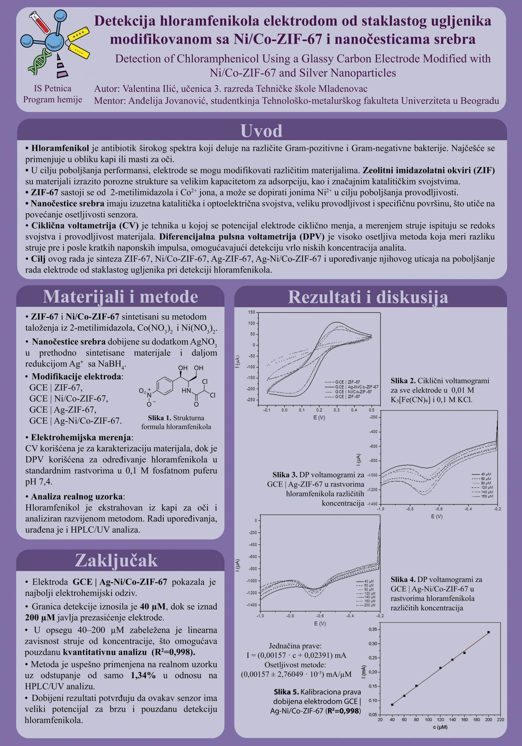 U ovom radu je razvijen novi elektrohemijski sensor za detekciju hloramfenikola, zasnovan na elektrodi od staklastog ugljenika (GCE) modifikovanoj nanočesticama srebra i zeolitnim imidazolatnim okvirima (ZIF). ZIF-ovi imaju velike kapacitete za adsorpciju zahvaljujući izrazito poroznoj strukturi, kao i značajna katalitička svojstva, što u kombinaciji sa nanočesticama srebra, koje povećavaju provodljivost, omogućava visoku osetljivost senzora. Pripremljeno je više modifikacija GCE: ZIF-67, Ni/Co-ZIF-67, Ag-ZIF-67 i Ag-Ni/Co-ZIF-67 koje su okarakterisane cikličnom voltametrijom, pri čemu je pokazano da Ag-Ni/Co-ZIF-67 ostvaruje najveći elektrohemijski odziv. Detekcija hloramfenikola vršena je koristeći GCE | Ag-Ni/Co-ZIF-67 pomoću diferencijalne pulsne voltametrije u koncentracionom opsegu od 40 µM do 200 µM. Dobijena je linearna zavisnost odziva elektrode i koncentracije hloramfenikola sa visokim stepenom korelacije (R2 = 0,998) i limitom detekcije 40 µM. Analiza realnog uzorka (kapi za oči) pokazala je odstupanje od samo 1,34% u odnosu na HPLC/UV analizu, što ukazuje da senzor GCE | Ag-ZIF-67 ima veliki potencijal za brzu i pouzdanu detekciju hloramfenikola.