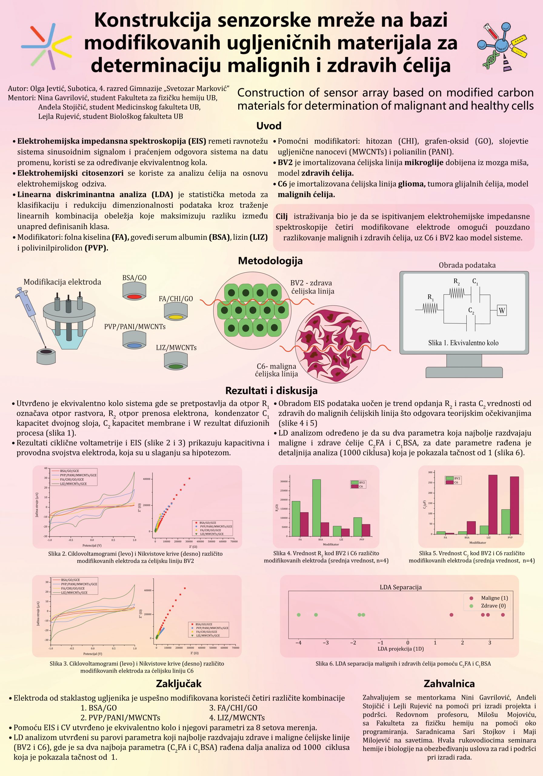Razvoj senzora za determinaciju malignih i zdravih ćelija ključan je za rano, pouzdano i isplativo otkrivanje kancera, čime se značajno povećavaju šanse za uspešno lečenje. Ovo istraživanje obuhvatalo je sintezu i karakterizaciju senzorske mreže za diferencijaciju malignih i zdravih ćelija. Kao model sistemi korišćene su BV2 i C6 ćelijske linije. Razvijena su četiri senzorska sistema na elektrodi od staklastog ugljenika. Elektrode na bazi grafen-oksida modifikovane su nanokompozitom goveđeg seruma albumina (BSA) i elektropolimerizovanom folnom kiselinom sa hitozanom (FA/CHI). Elektrode na bazi slojevitih ugljeničnih nanocevi modifikovane su elektrodeponovanim polivinilpirolidonom i polianilinom (PVP/PANI) i elektropolimerizovanim lizinom (LIZ). Metodom elektrohemijske impedansne spektroskopije utvrđeno je ekvivalentno kolo sistema i njegovi parametri korišćeni su u daljoj analizi. Merenja sa obe ćelijske linije rađena su u četvoroplikatu. Linearnom diskriminantnom analizom (LDA) određeno je da su dva parametra koja najbolje razdvajaju maligne i zdrave ćelije C1BSA i C2FA. Detaljnija LDA, 1000 ciklusa, rađena je sa najboljim parametrima i pokazala je tačnost od 1. Razvijena elektrohemijska metoda se teorijskim i eksperimentalnim ispitivanjima pokazala pouzdanom pri diferencijaciji malignih i zdravih ćelija.