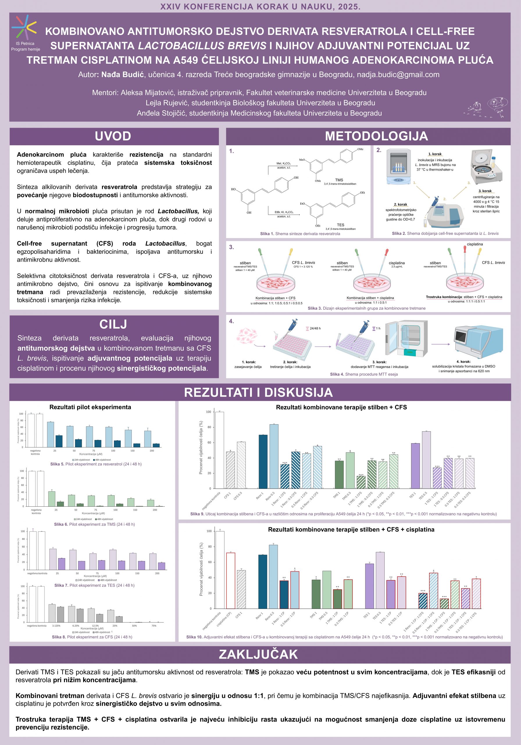 Adenokarcinom pluća karakteriše visok potencijal za razvoj rezistencije na standardni hemioterapeutik cisplatinu, čija prateća sistemska toksičnost predstavlja dodatnu prepreku u lečenju. Resveratrol se ističe kao potencijalni adjuvantni agens, ali je njegova primena značajno ograničena niskom bioraspoloživošću. U cilju prevazilaženja navedenih ograničenja, u ovom radu sintetisani su alkilovani derivati 3,4′,5-trans-trimetoksistilben (TMS) i 3,4′,5-trans-trietoksistilben (TES), čije strukturne modifikacije potencijalno omogućavaju bolju apsorpciju i veću stabilnost. Rod Lactobacillus čini deo normalne mikrobiote pluća, a njegov cell-free supernatant (CFS) bogat bioaktivnim metabolitima ispoljava antitumorsku aktivnost. U ovom istraživanju ispitan je antitumorski potencijal resveratrola i njegovih derivata, koji pripadaju grupi stilbena, u kombinaciji sa CFS bakterije L. brevis KAUS2-46 kao i njihov adjuvantni potencijal uz tretman cisplatinom. Antitumorska aktivnost određena je MTT testom, uz kvantifikaciju sinergističkog dejstva primenom Blissovog modela nezavisnosti i statističku analizu Dunnettovim testom. Sintetisani derivati pokazali su veći citotoksični efekat od resveratrola. Kombinovani tretmani svih derivata stilbena i CFS ostvarili su sinergiju u odnosu 1:1, pri čemu je kombinacija TMS i CFS bila najefikasnija, indukujući inhibiciju rasta od 83,6%. Sinergističko dejstvo stilbena u kombinaciji sa cisplatinom potvrđuje njihov adjuvantni potencijal u svim testiranim odnosima. Najznačajniji efekti postignuti su trostrukom terapijom uz primenu cisplatine (IC30), pri čemu su sve kombinacije u odnosu 1:1:1 pokazale sinergistički efekat. Kombinacija TMS, CFS i cisplatine je ostvarila maksimalnu inhibiciju rasta od 87,2%, statistički značajno nadmašujući monoterapiju. Ovi rezultati ukazuju da primena derivata resveratrola i CFS L. brevis kao adjuvanasa omogućava smanjenje terapijske doze cisplatine, čime se potencijalno umanjuje prateća sistemska toksičnost i rizik od razvoja rezistencije na ovaj hemioterapeutik.