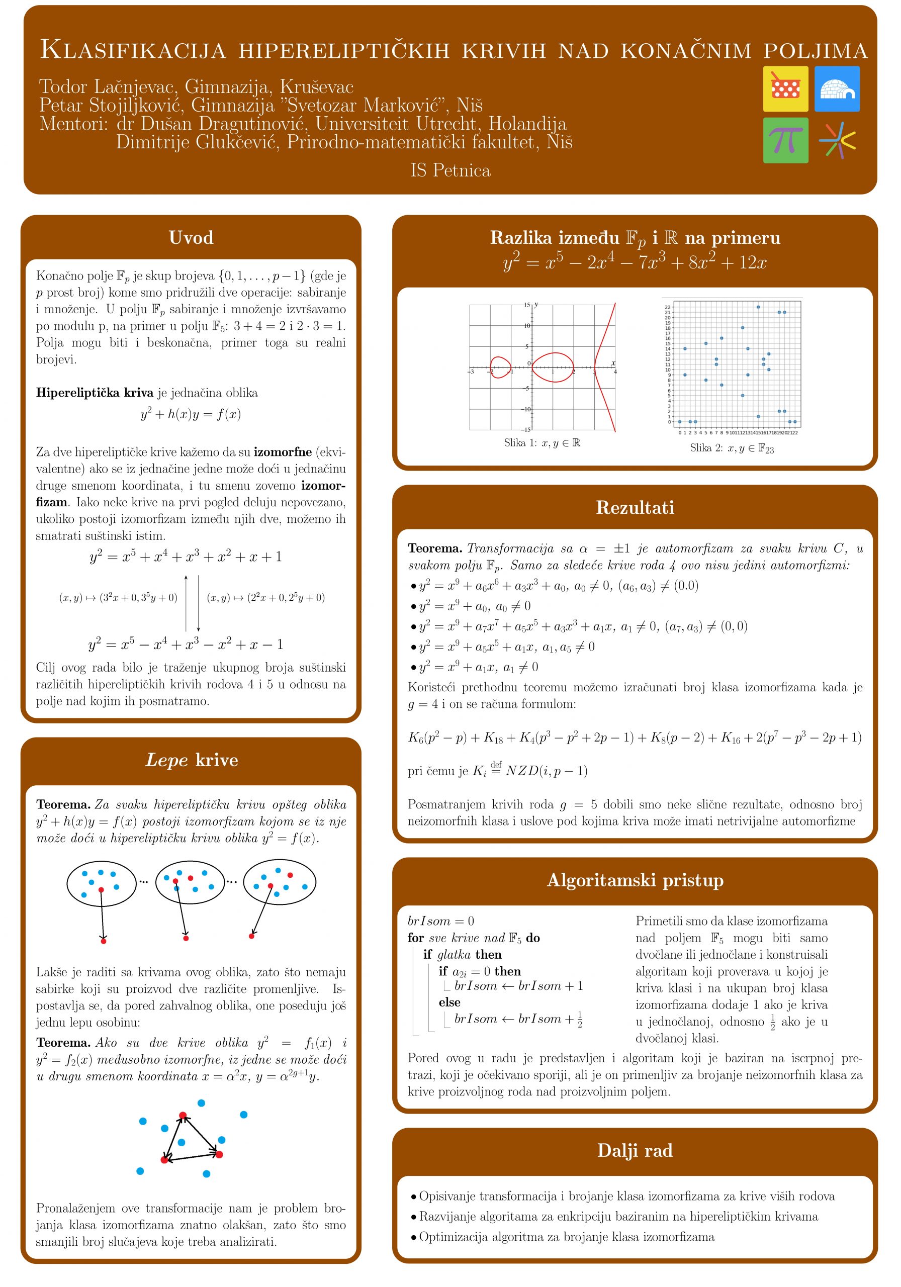 Hipereliptičke krive roda najviše 3 nad konačnim poljima proučavaju se i preporučuju za primenu u kriptografiji već oko dve decenije. Iako se krive viših rodova generalno ne smatraju dovoljno bezbednim za klasične kriptografske primene poput digitalnog potpisa, određene specijalne krive ovog roda mogu imati prednosti u kontekstu sistema zasnovanih na sparivanju. Klasifikacija hipereliptičkih krivih po izomorfizmu igra ključnu ulogu u izboru bezbednih krivih za praktične primene. Dok su klase izomorfizama za krive roda 2 i 3 već detaljno proučene, ovaj rad se bavi računanjem broja klasa izomorfizama kod hipereliptičkih krivih rodova 4 i 5 nad konačnim poljima karakteristike veće od tri. Pored toga, analizirani su uslovi pod kojima takve krive poseduju netrivijalne automorfizme. U radu su predstavljena i dva algoritma za brojanje klasa: jedan baziran na iscrpnoj pretrazi, a drugi efikasniji, koji koristi neke osobine krivih pri fiksiranju polja nad kojim su posmatrane.