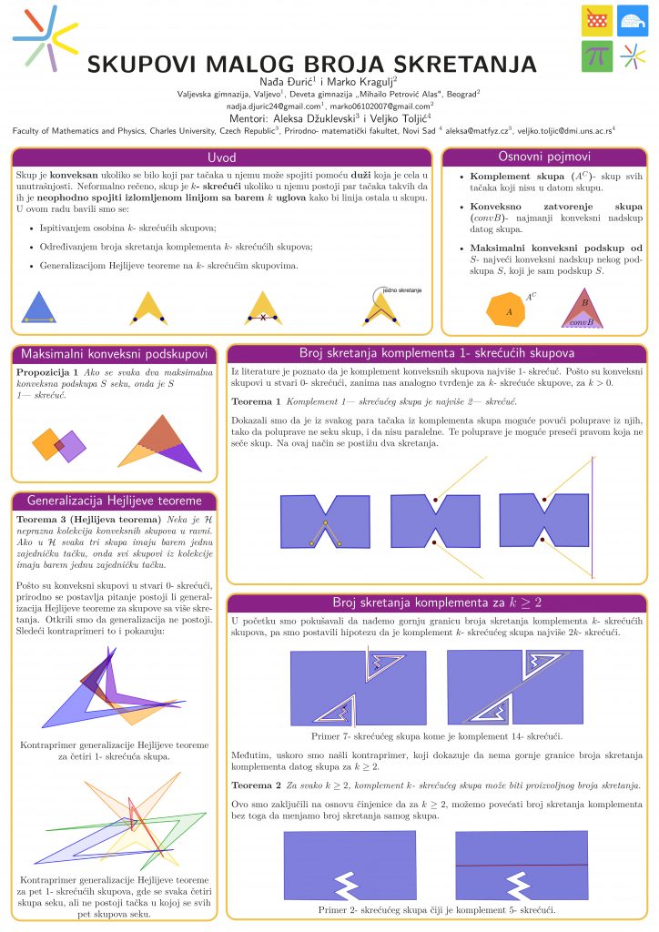 Skup je najviše k-skrećući ako za svake dve tačke A i B postoji izlomljena linija sa k skretanja koja spaja A i B i cela se nalazi u skupu, gde izlomljenu liniju definišemo kao niz duži A1B1, A2B2, …AkBk, tako da važi Bi=Ai+1. Kažemo da je neki skup k- skrećući ako je k najmanji ceo broj skretanja tako da je skup najviše k- skrećući. U ovom radu bavimo se svojstvima konveksnih skupova koja se lepo mogu generalizovati za skupove malog broja skretanja; ili idealno, za svako k∈ N0. Fokusirali smo se na k- skrećuće mnogouglove. U ovom radu dokazano je da su svi mnogougovi čija se svaka dva maksimalna konveksna podskupa seku 1- skrećući. Pored ovoga, određen je i broj skretanja komplementa 1- skrećućih mnogouglova, ali i da za k>1 ne postoji gornja granica broja skretanja komplementa. Takođe je pokušana generalizacija Hejlijeve teoreme za k- skrećuće mnogouglove, i pokazano je da teorema ne važi za k- skrećuće mnogouglove u dve i tri dimenzije.