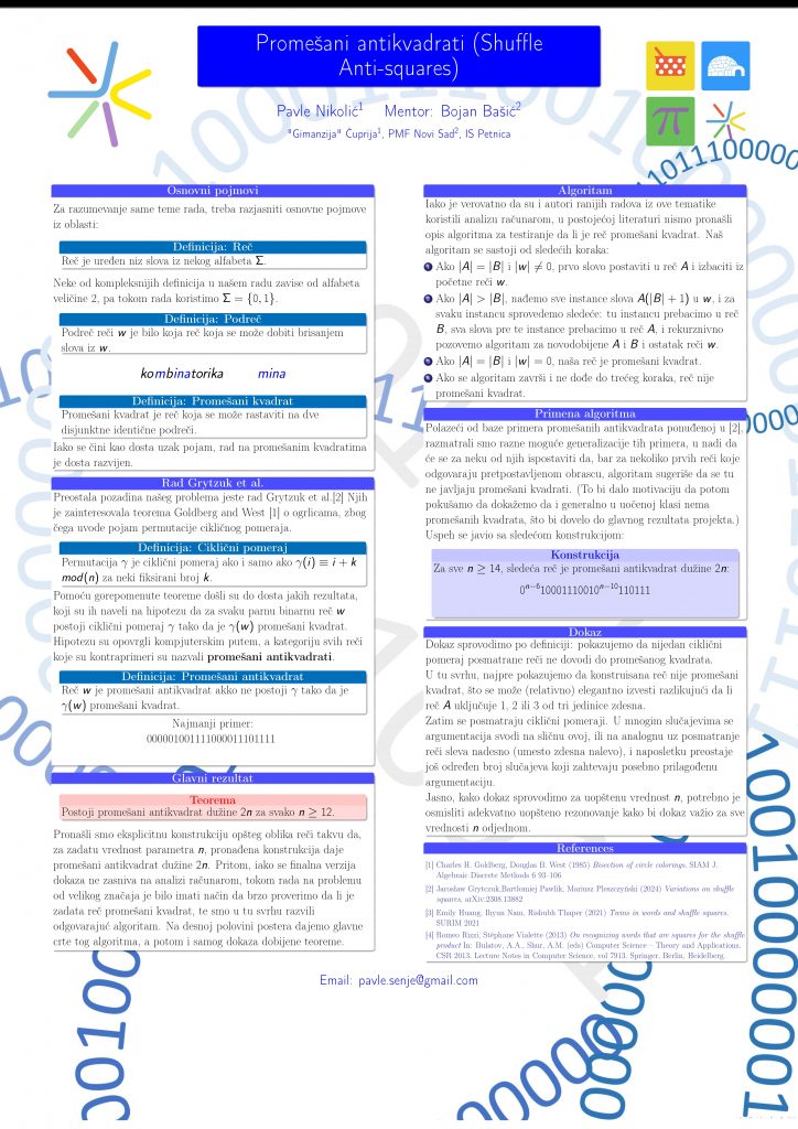 Kombinatorika na rečima je oblast koja se bavi analiziranjem nizova simbola i nalazi primenu u mnogim oblastima gde se oni pojavljuju, kao što su kriptografija i analiza DNK sekvenci. Navedene nizove nazivamo rečima. Osnovni pojam podoblasti kojom se bavimo je posebna vrsta reči koje se nazivaju promešani kvadrati. Promešani kvadrat je reč koja se može rastaviti na dve disjunktne identične podreči, pri čemu podreč podrazumeva reč koja se može dobiti brisanjem slova iz početne reči. U radu „Variations on shuffle squares“, Grytczuk et al. postavljaju hipotezu da, za svaku parnu dužinu 2n za n>12, postoji tzv. promešani antikvadrat dužine 2n; pritom, pojam promešanog antikvadrata se definiše kao reč takva da, donekle neformalno govoreći, nijedna reč koja se može dobiti kao ciklični pomeraj posmatrane reči nije promešani kvadrat. U ovom radu je navedena hipoteza dokazana. Dokaz je konstruktivne prirode. Najpre je kompjuterskom analizom manjih primera uočena klasa reči određenog opšteg oblika za koju je delovalo verovatno da reči proizvoljno velike dužine iz te klase jesu promešani antikvadrati, a potom je ova tvrdnja i dokazana detaljnom strukturnom analizom posmatrane klase reči (bez oslanjanja na kompjuterska ispitivanja).